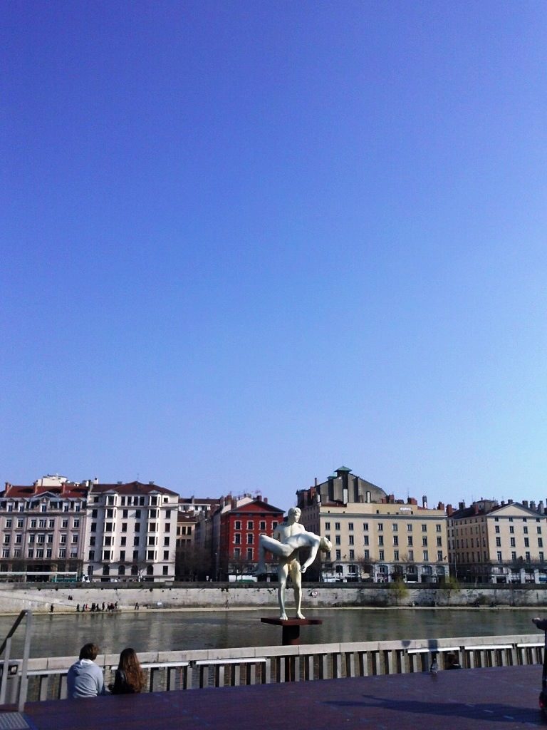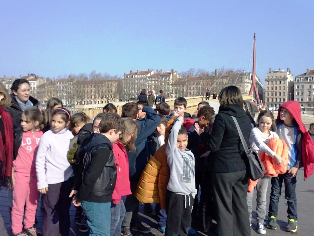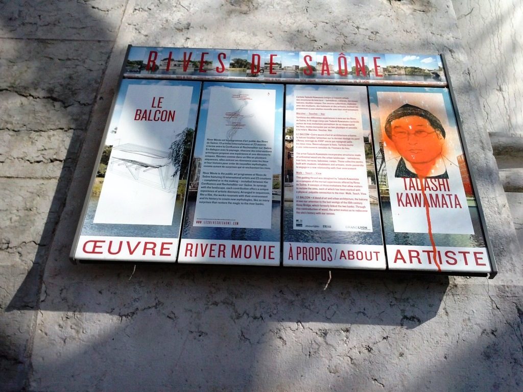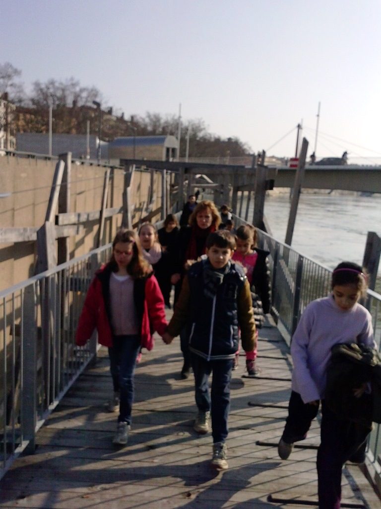 Nous avons marché sur un balcon construit par un artiste japonais ; il était construit en bois. Le bois était brûlé pour ne pas que les mites l’abîment. Ce balcon était fixé au début d’un pont qui a été bombardé par les Allemands pendant la deuxième guerre mondiale quand ils ont quitté Lyon. Après nous sommes descendus sur les quais…
