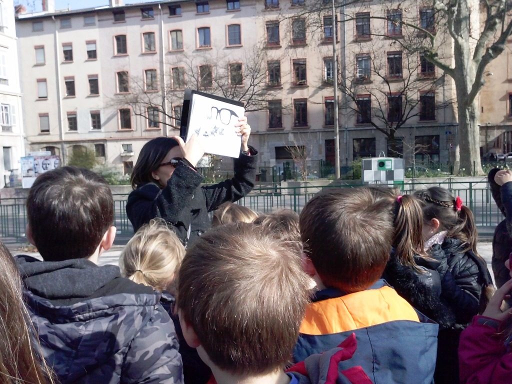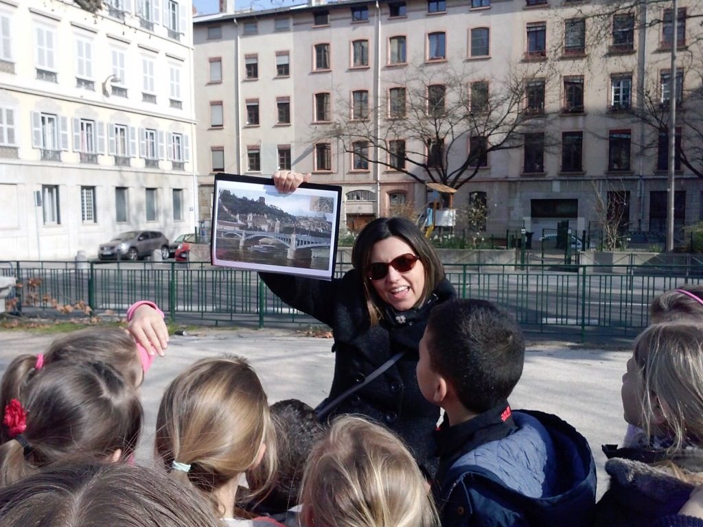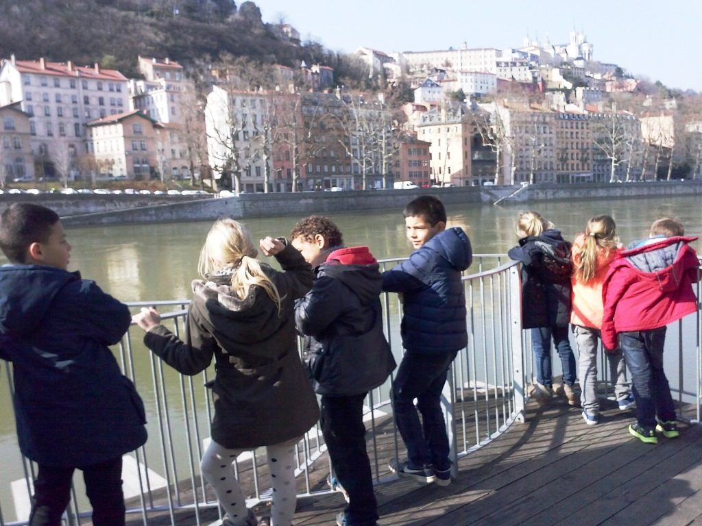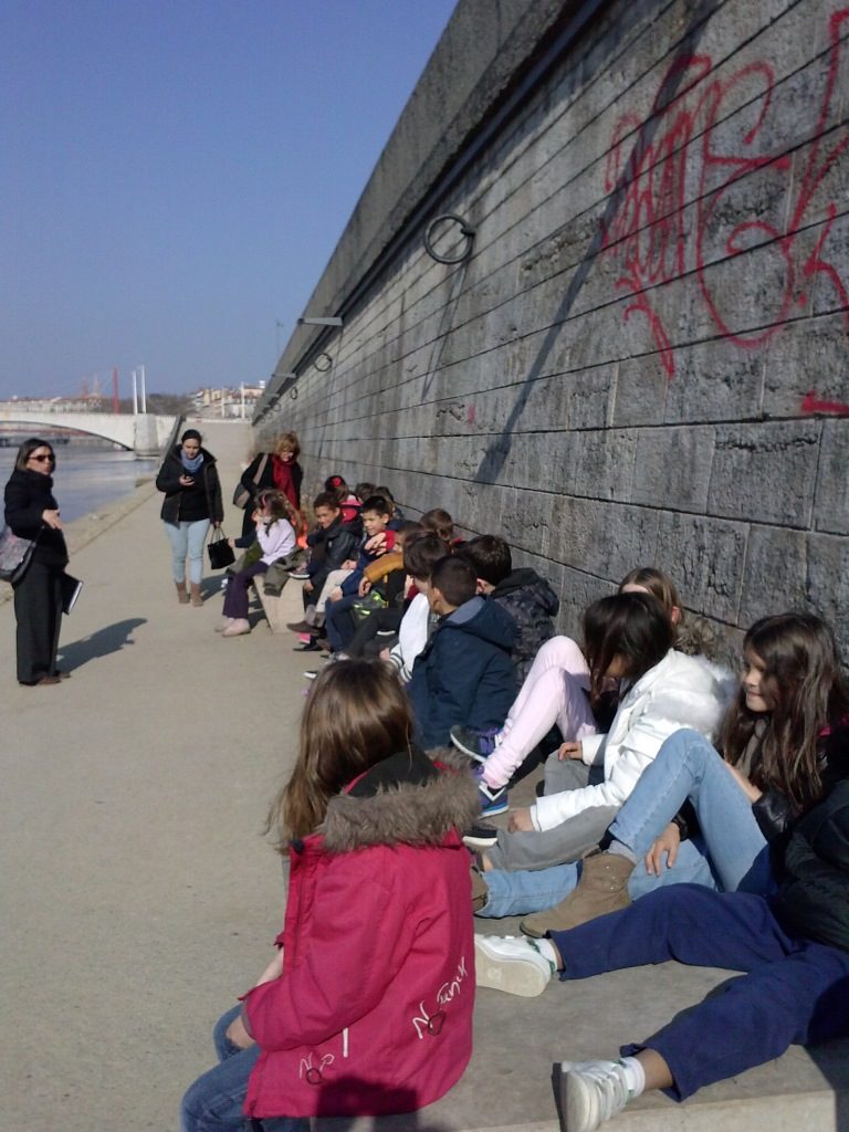 Nous avons marché sur un balcon construit par un artiste japonais ; il était construit en bois. Le bois était brûlé pour ne pas que les mites l’abîment. Ce balcon était fixé au début d’un pont qui a été bombardé par les Allemands pendant la deuxième guerre mondiale quand ils ont quitté Lyon. Après nous sommes descendus sur les quais…