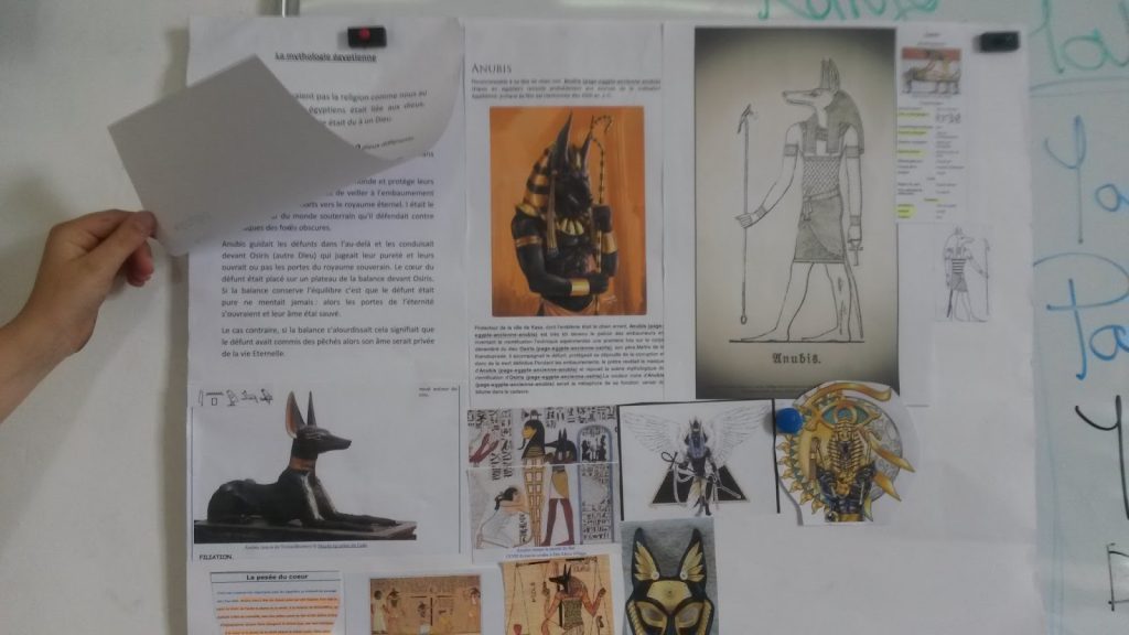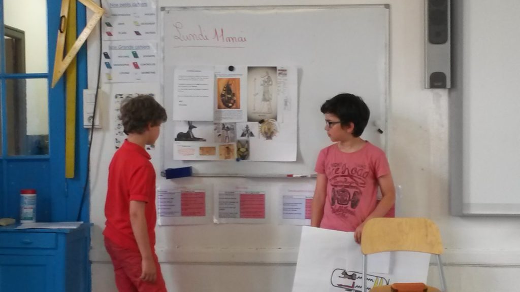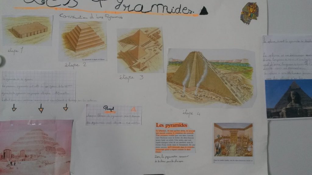 Cela a été l’occasion pour les enfants de réaliser de nombreux exposés sur des thèmes différents: les dieux égyptiens, les hiéroglyphes, les pyramides, les symboles de l’Égypte.