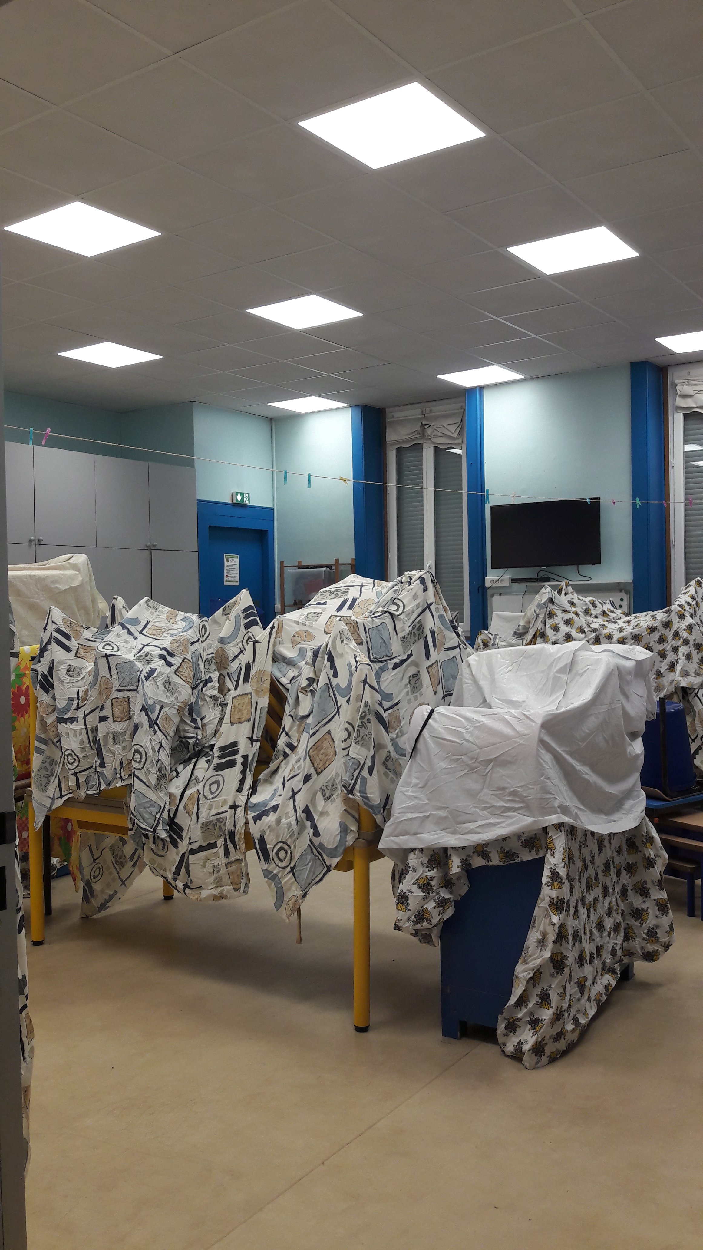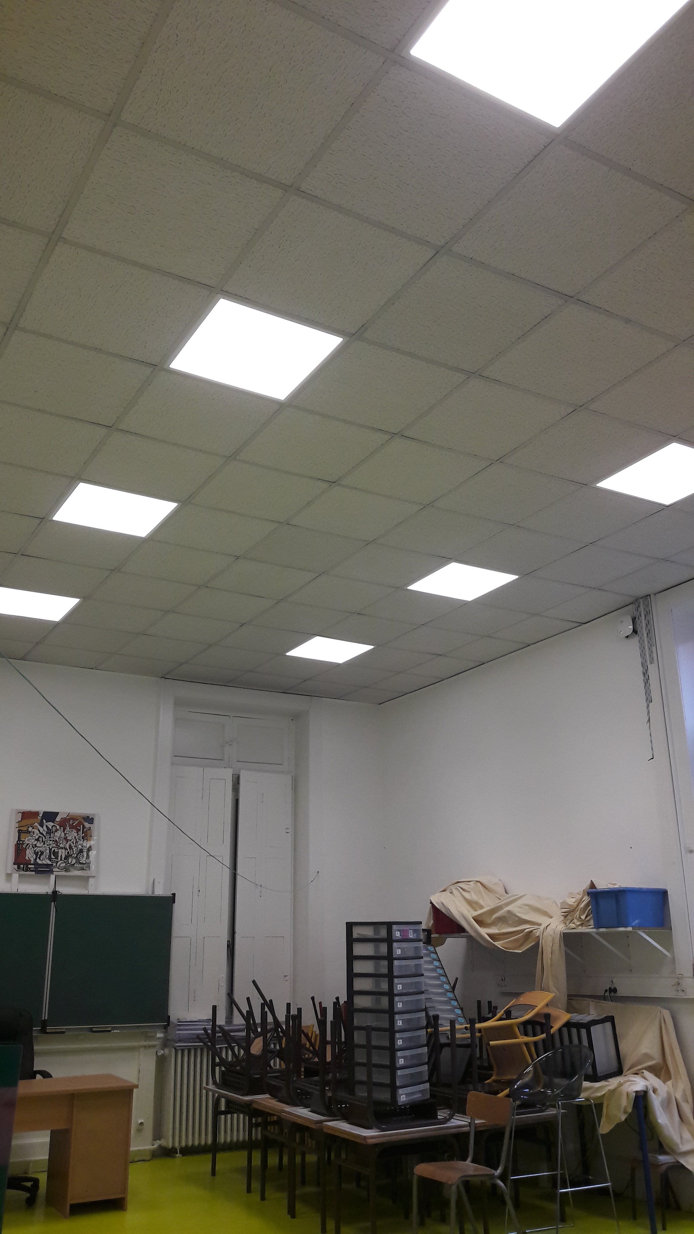 Cette année, changement des blocs de néons dans les classes par des blocs de Led, bien moins énergivores! Ces luminaires sont conçus et fabriqués en France, et respectent les toutes dernières normes concernant l’éblouissement dans les lieux recevant du public.